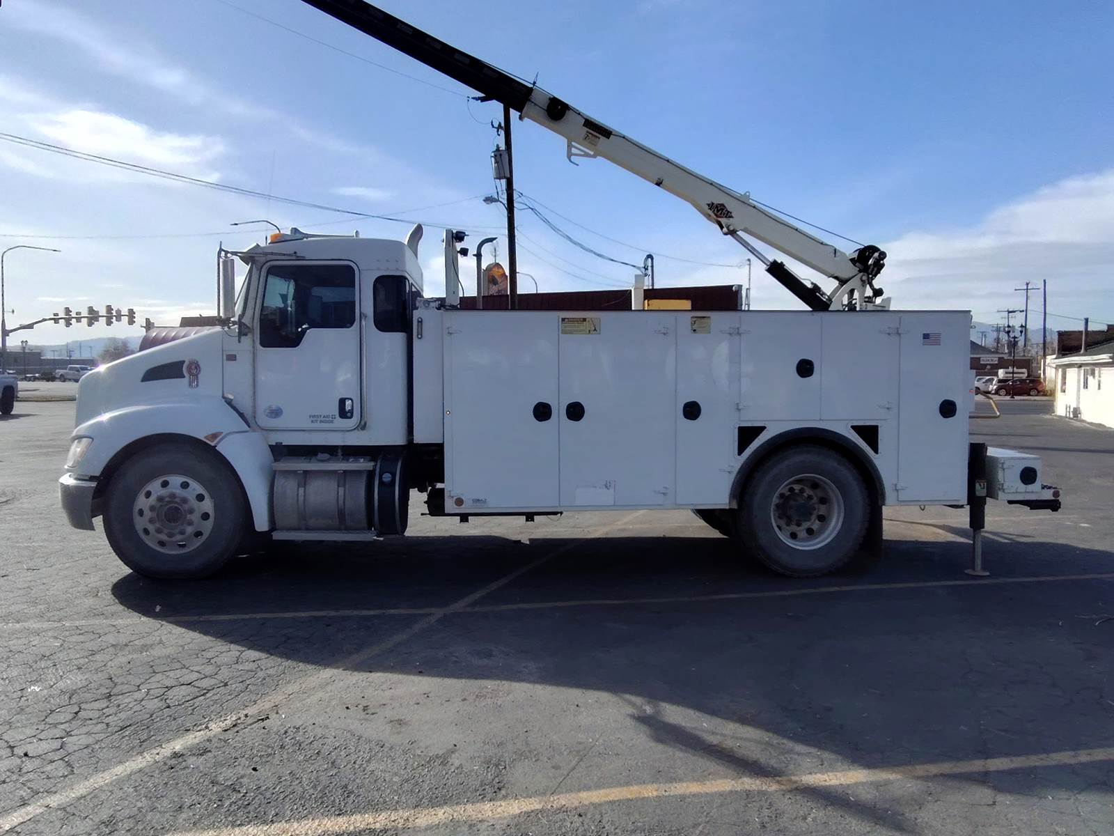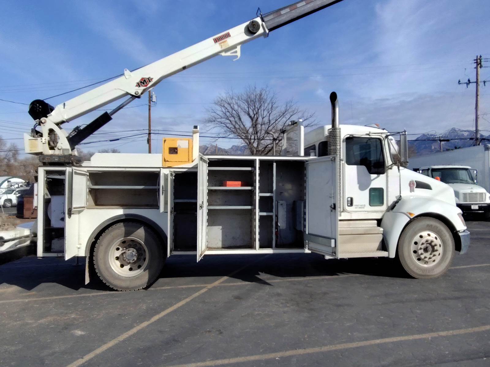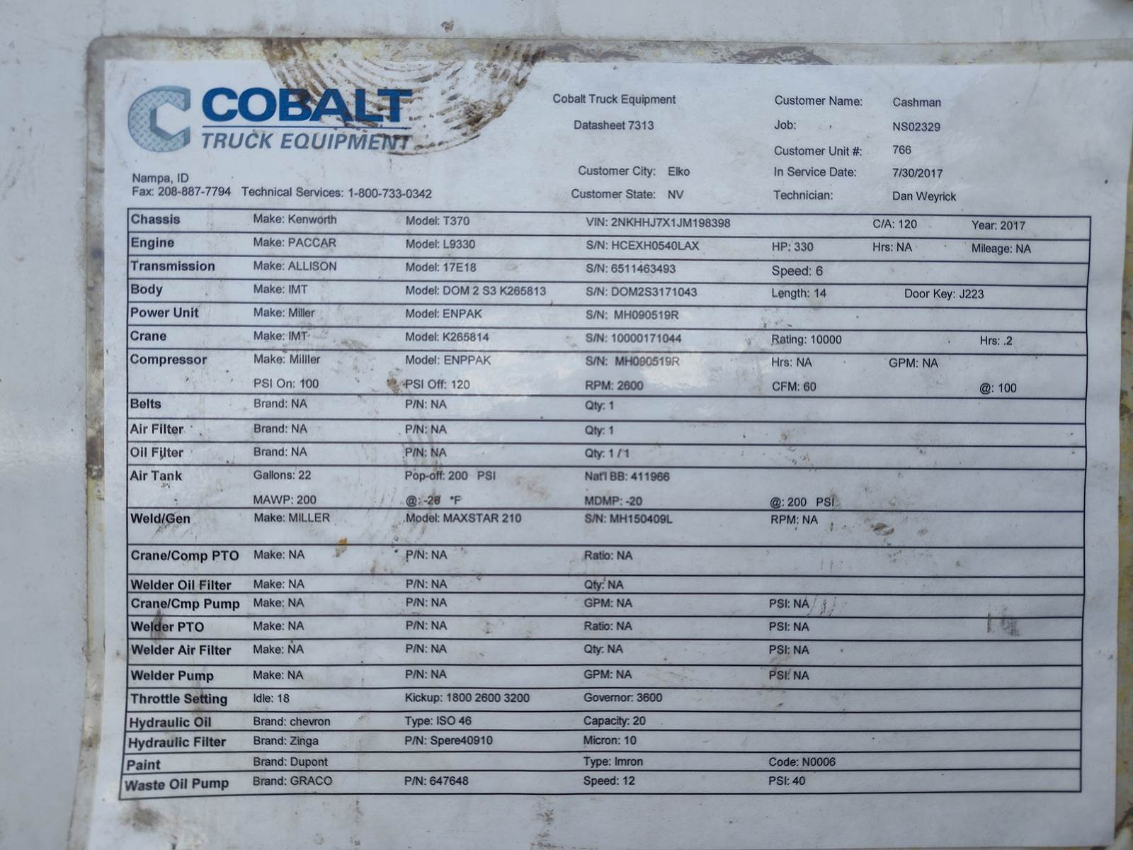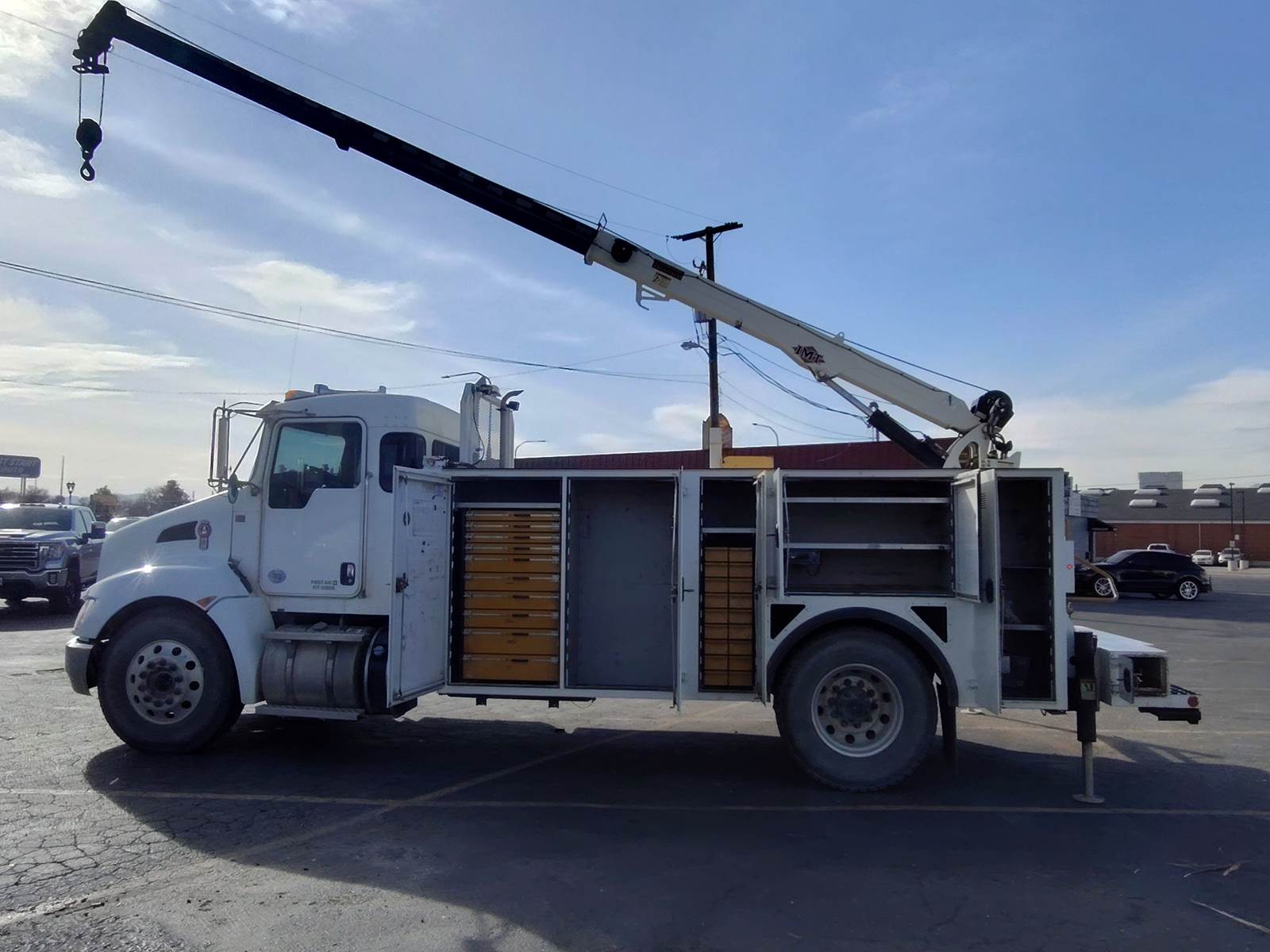 Here is a LOW MILES, Very clean Mechanic's truck. 14' Cobalt truck equipment body, 60" tall compartments Driver side and passenger front, and 52" on the rear passenger side, Plenty of storage. Enpak system, 10,000 lb crane, 32' Reach. Hydraulic air compressor, 2 Hose reels. Inverter. Allison 3,000 RDS Automatic transmission, 6-Speed. Paccar PX-9, 8.9L. 330 HP. 12,000 lb front axle. 21,000 lb rear axle. 33,000 G.V.W.R. 192 W.B. 120 C.A. Chrome bumper, Stainless steel visor. Power locks. Power windows. Power steering, Power mirrors. Engine brake. Diff Lock, leaf air ride suspension, air ride seat on driver side, Battery Kill switch, Tinted windows, A/C. AM/FM/CD Radio. Aluminum wheels, Aluminum fuel tank DPF DEF. Right hand vertical stack. 10 drawer tool cabnet. bot bin. Miller Maxstar 210 Series welder w/ Leads. 27.75" Work bench bumper with vise. Reciever hitch, 11R22.5 tires 80% or better.